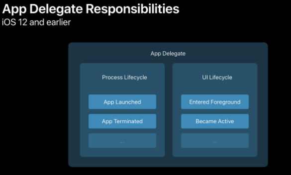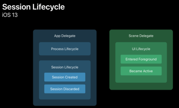 iOS13이전 12까지는 AppDelegate에서 작업을 다했지만 iOS 13부터 Session Lifecycle을 AppDelegate와 SceneDelegate가 나누어서 담당하고 있다.