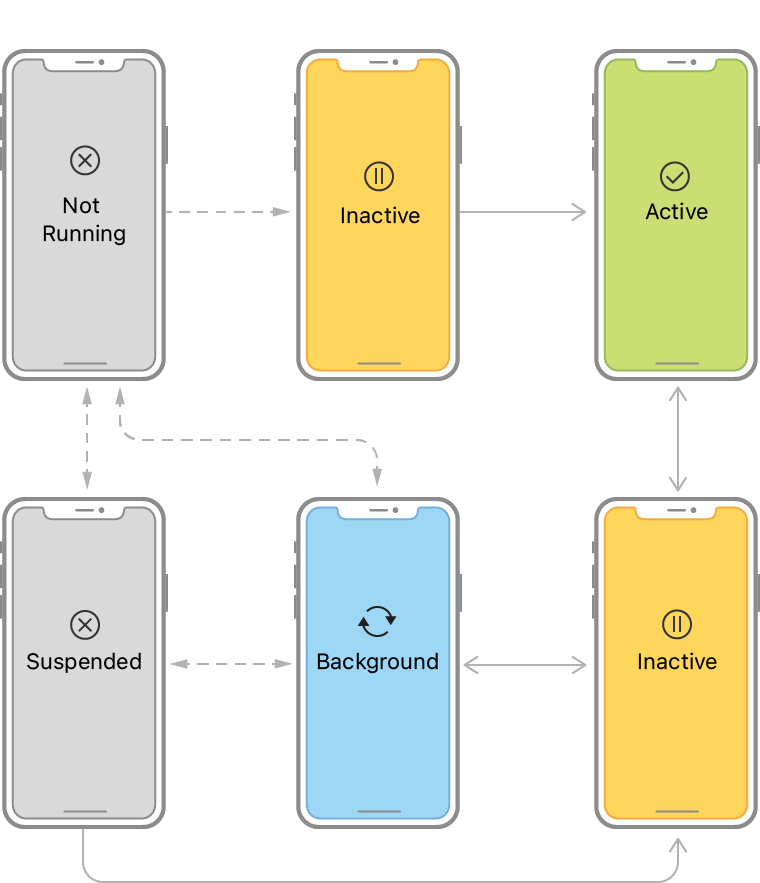 다음의 그림은 앱 델리게이트 객체를 포함하는 상태 변환을 보여준다. 런치 후에, 시스템은 UI가 화면에 보이려는지 여부에 따라 inactive나 background 상태에 앱을 넣는다. 포그라운드에 런치할 때, 시스템 변환은 active 상태로 자동적으로 이동한다. 이후에, 상태는 액티브와 백그라운드 사이를 앱이 종료할 때까지 변화한다.