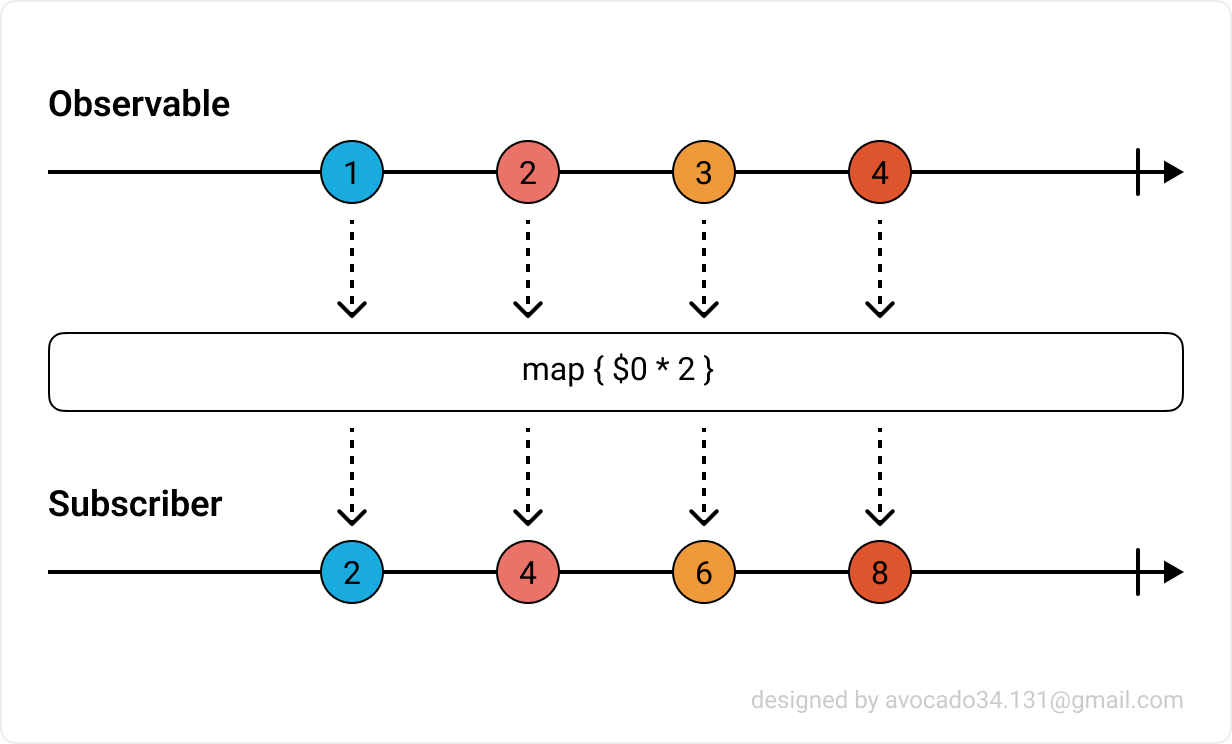 Observable을 통해서 방출되는 모든 요소에 대해서 중간에 계산을 하거나 타입을 변경 시켜주고 싶을 때 간편하게 처리한다.