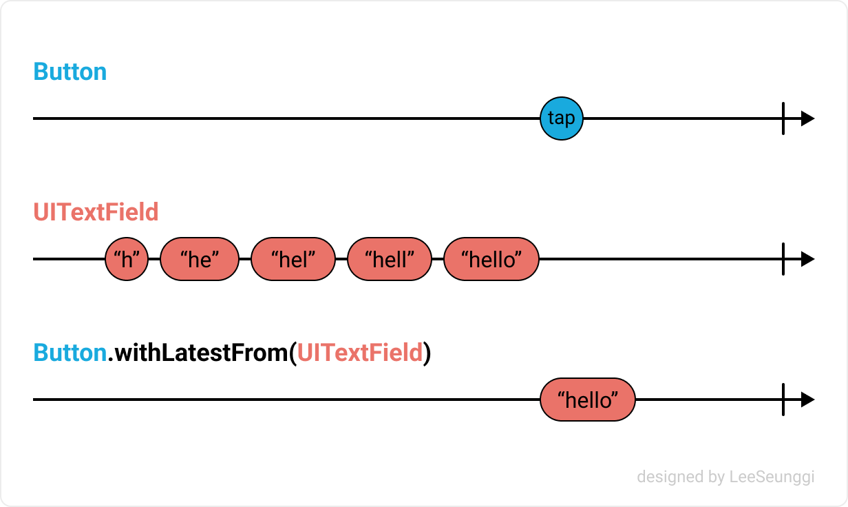 trigger Observable에서 요소가 방출될 때마다 target Observable에서 가장 최근에 방출되었던 요소를 전달해주는 것을 확인할 수 있다.