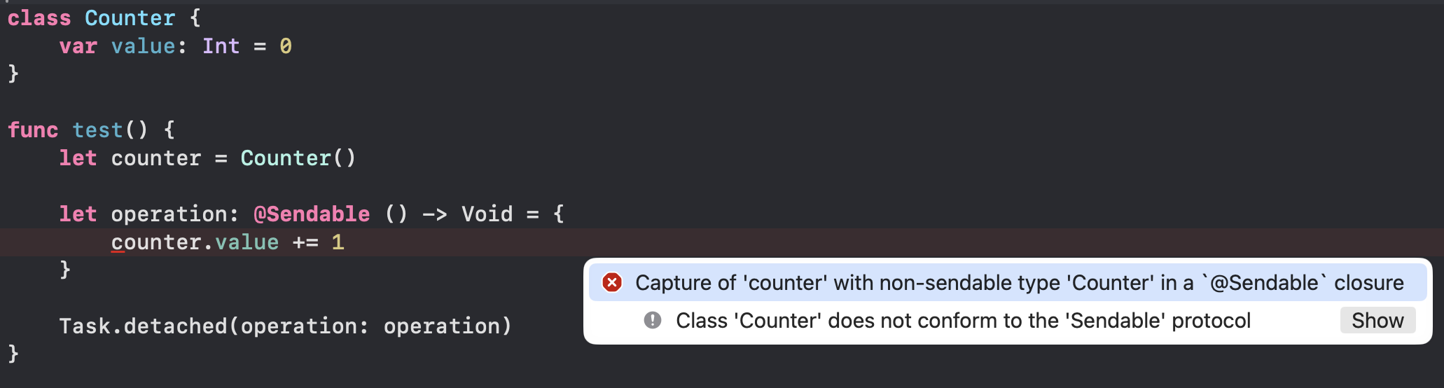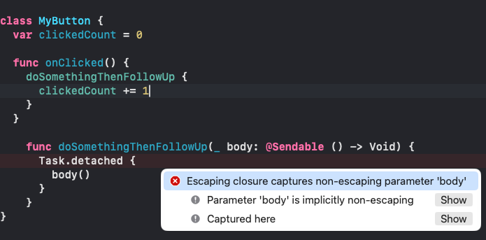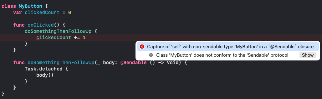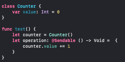 @Sendable 클로저에서 비-Sendable 타입을 캡처하면 컴파일 오류